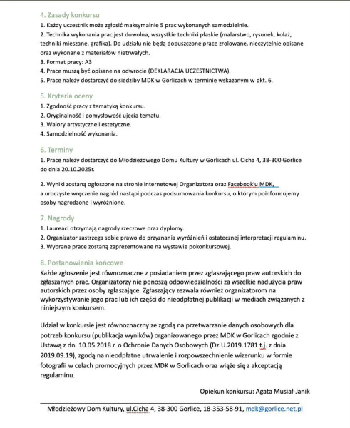 7. Zgłoszenia na przesłuchania finałowe prosimy nadsyłać do dnia 7 listopada 2025 na adres: Młodzieżowy Dom Kultury w Gorlicach ul. Cicha 4, 38-300 Gorlice, mail mdk@gorlice.net.pl. Koordynacją konkursu zajmuje się Dominika Kubala (tel. 518373213).