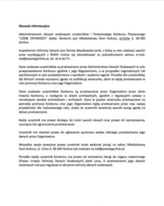 1. Administratorem danych osobowych przekazanych przez uczestników jest Organizator Konkursu – Pałac Młodzieży w Nowym Sączy, z siedzibą Rynek 14, 33-300 Nowy Sącz, oraz Wydawnictwo Diecezji Tarnowskiej „Promyczek” z siedzibą Plac Kolegiacki 4, 33-300 Nowy Sącz, które zapewnia wszystkim zgłoszonym uczestnikom realizację uprawnień wynikających z unijnego Rozporządzenia Parlamentu Europejskiego i Rady (UE) 2016/679 z dnia 27 Kwietnia 2016 r. w sprawie ochrony osób fizycznych w związku z przetwarzaniem danych osobowych i w sprawie swobodnego przepływu takich danych.