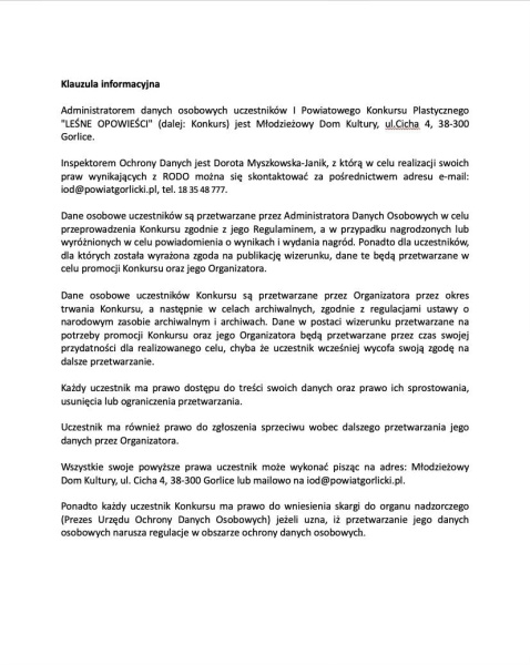 4. Wyrażam zgodę na przetwarzanie przez organizatora – Pałac Młodzieży w Nowym Sączu i Wydawnictwo „Promyczek” oraz partnerów konkursu, danych osobowych podanych przeze mnie w związku z przystąpieniem do Ogólnopolskiego Konkursu Polskiej Poezji Religijnej „Pierścień Świętej Kingi” celu przeprowadzenia i realizacji konkursu. Wyrażam zgodę na opublikowanie imienia i nazwiska mojego dziecka, miejscowości, z której pochodzę, i wizerunku na stronach internetowych: www.promyczek.pl i www.palacmlodziezy.pl oraz profilach społecznościowym Facebook. Jednocześnie informuję, że jestem świadomy dobrowolności podania danych osobowych oraz że zostałem poinformowany o prawie wglądu do moich danych, możliwości ich poprawiania oraz zgłoszenia sprzeciwu co do dalszego ich przetwarzania oraz na przekazanie moich danych osobowych fundatorowi nagród.